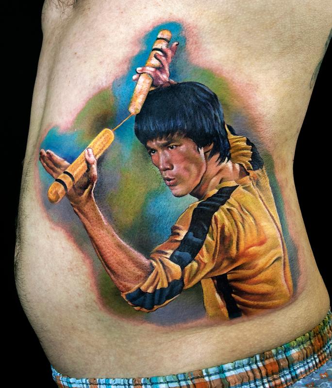 Bruce Lee color portrait tattoo